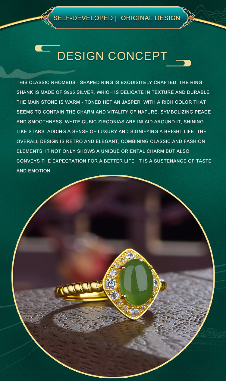 Envision the beauty of the warm-toned Hetian jasper main stone. exuding a rich color that captures the essence of nature's charm and vitality. Adorned with sparkling white cubic zirconias that twinkle like stars. it radiates luxury and symbolizes a life filled with brightness.