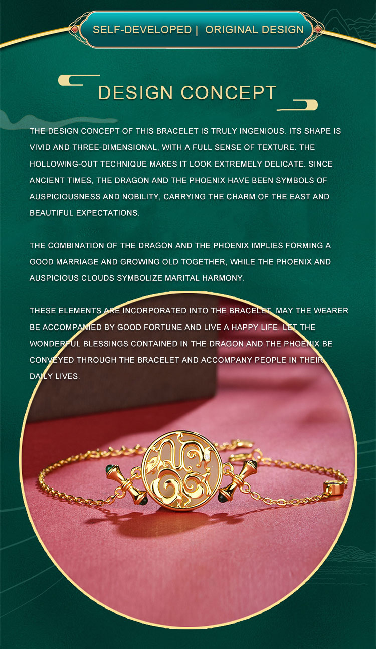 • Our Dragon And Phoenix Bracelet is a self - developed. original design. protected by an independent copyright and a design patent certificate. The design is a masterful blend of ancient symbolism and modern aesthetics. resulting in a truly unique piece.