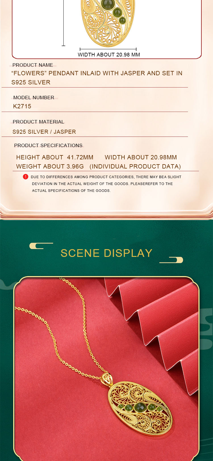 This versatile pendant is suitable for a wide range of occasions. For formal events such as weddings. galas. or business dinners. it adds a touch of glamour and sophistication to your outfit. The intricate filigree work and the beautiful Jasper stone make it a statement piece that will draw attention. In more casual settings. like a weekend brunch or a day out with friends. it serves as a stylish accessory that adds a pop of color and texture. You can pair it with a little black dress for a classic look. or with a simple blouse and jeans for a more laid - back yet fashionable appearance.