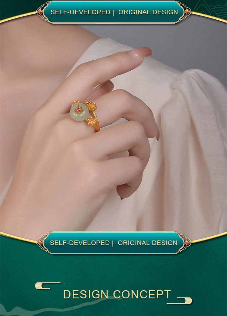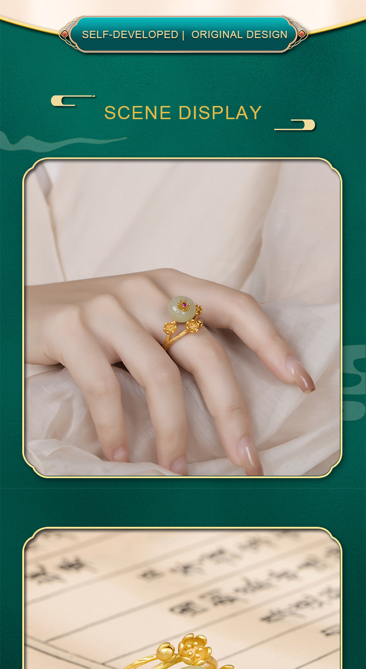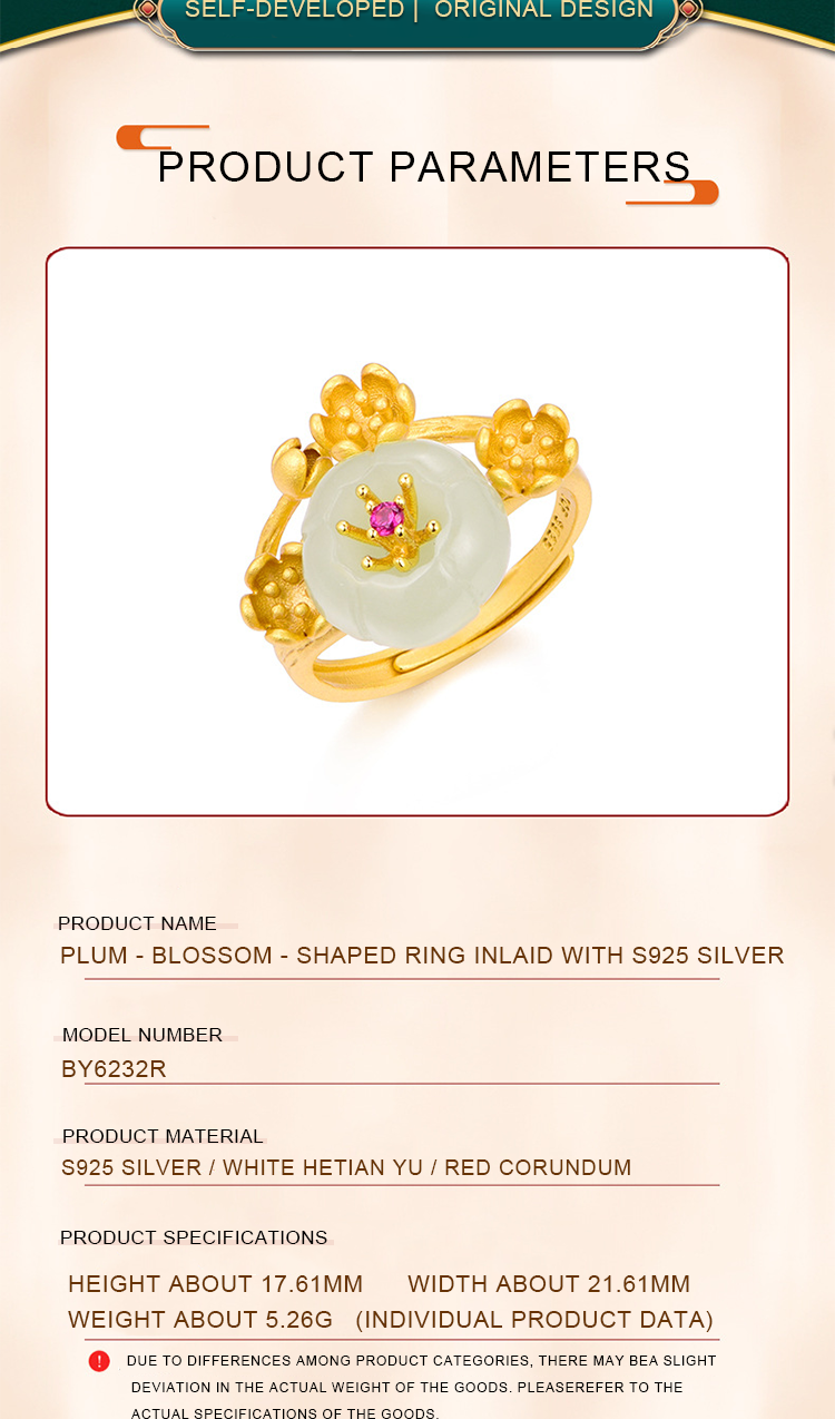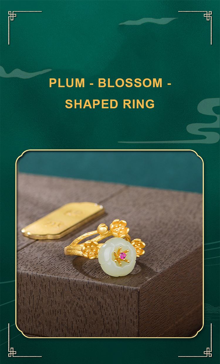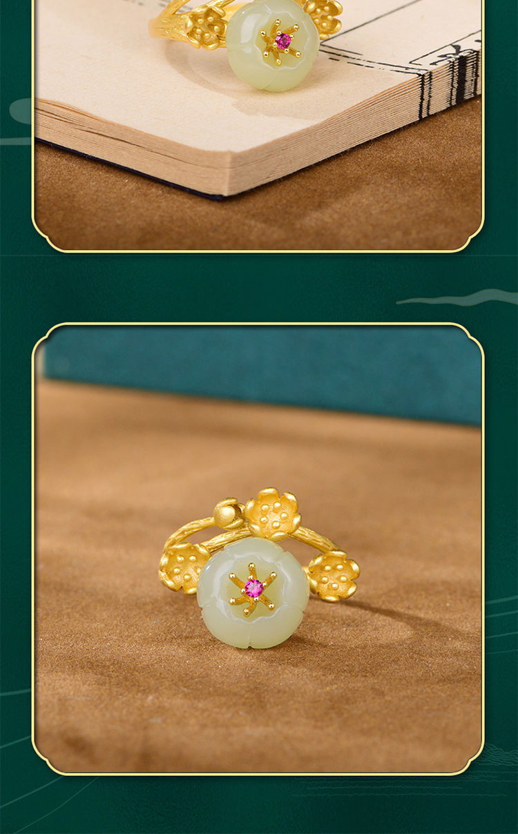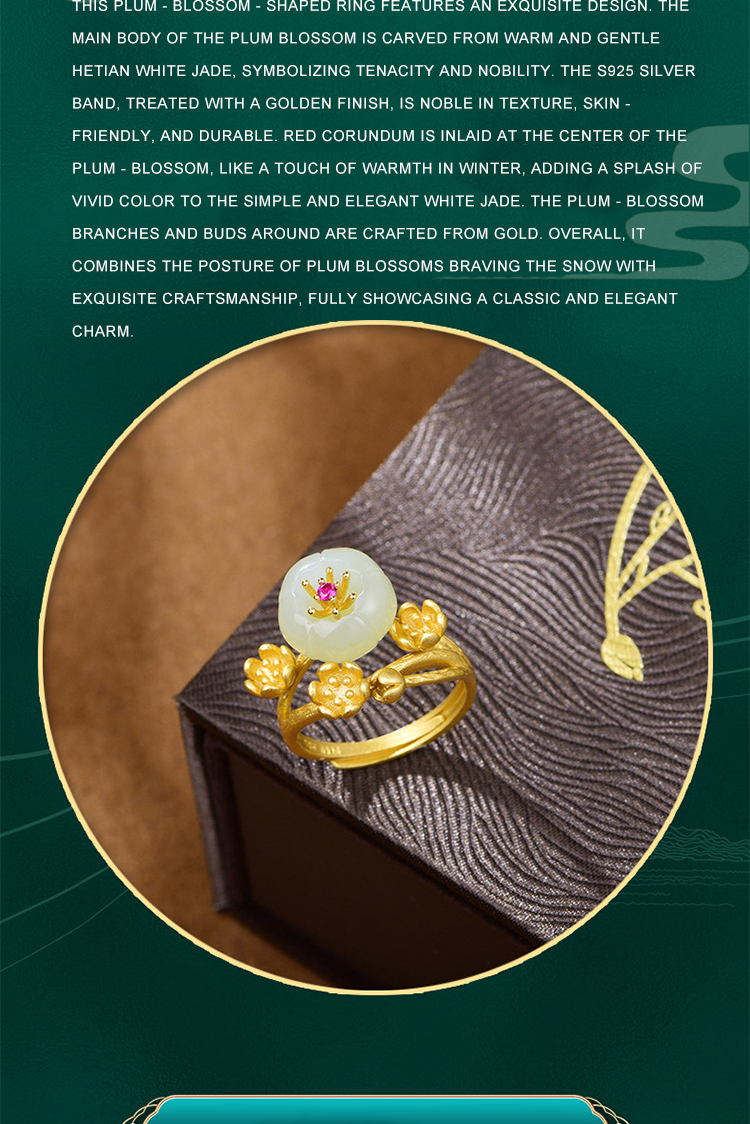 Crafted from warm Hetian white jade symbolizing tenacity and nobility. this ring features a golden-finished S925 silver band that is both noble and durable.The touch of red corundum at the center adds a vibrant pop of color. reminiscent of warmth in winter.Plus. the intricate gold craftsmanship of plum-blossom branches and buds exudes elegance.