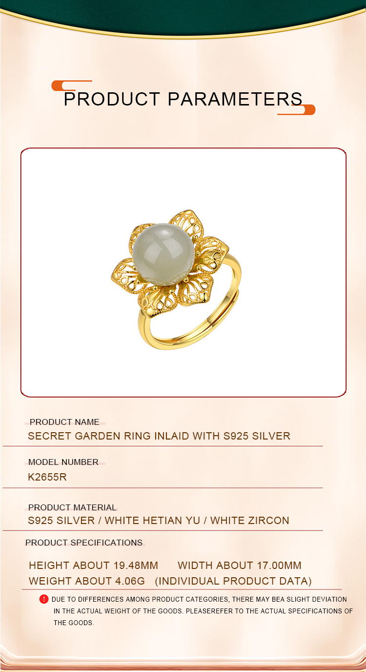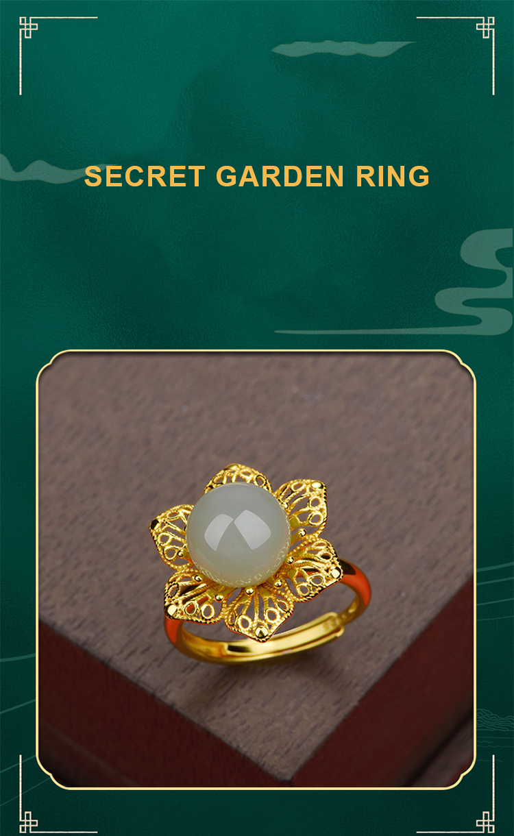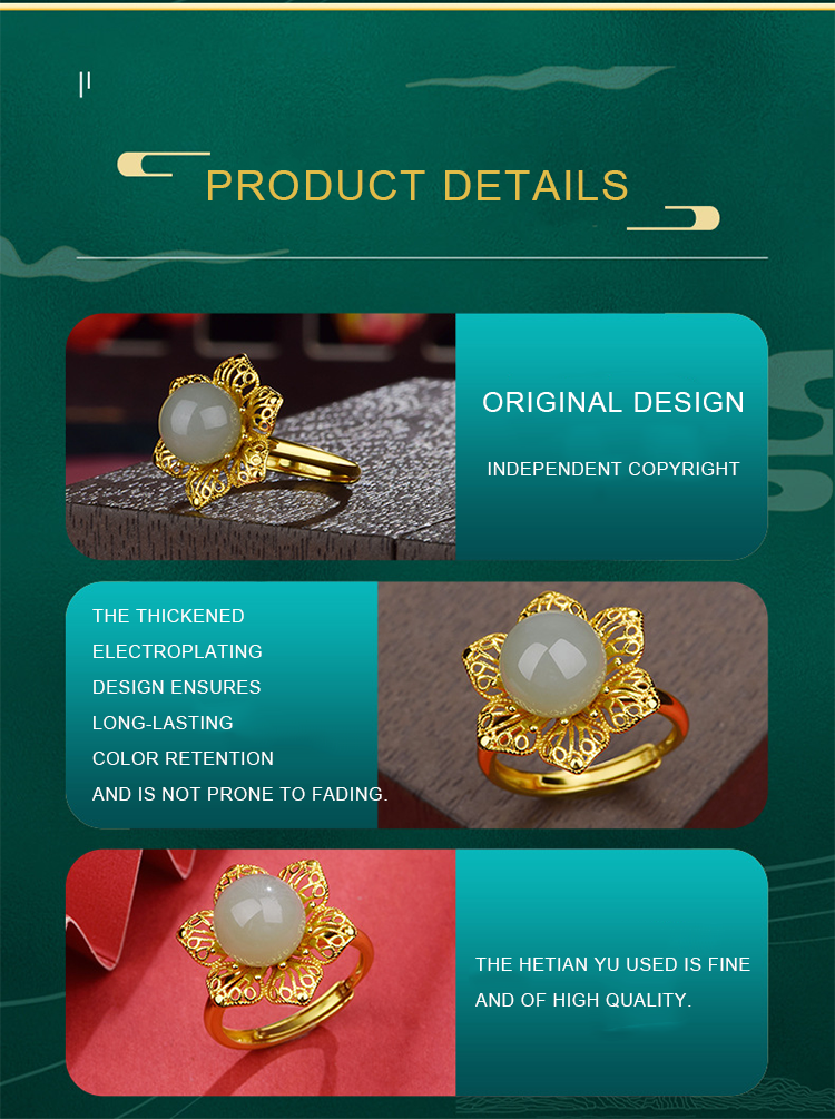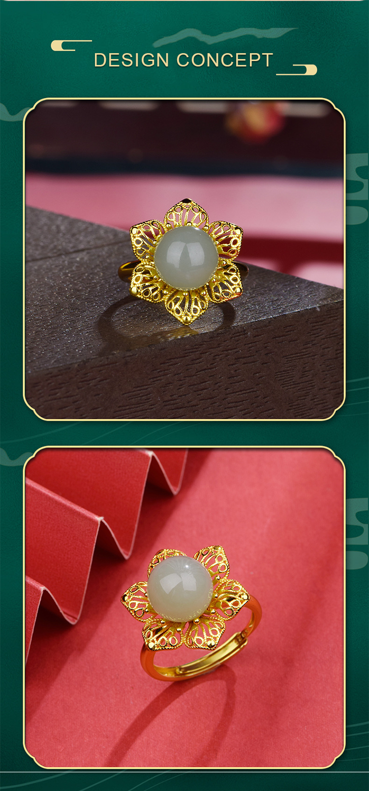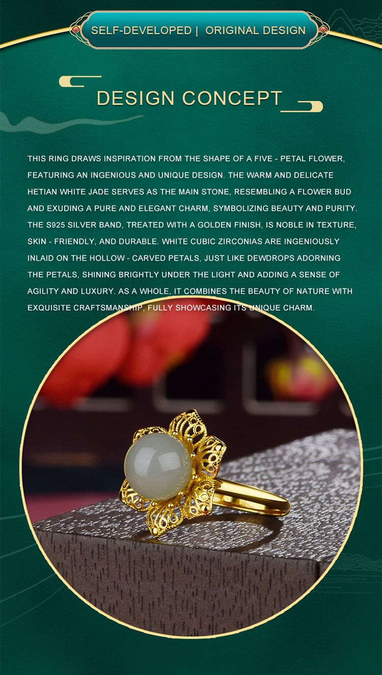 Crafted with the finest Hetian white jade as the main stone. this ring resembles a blooming flower bud. radiating a pure and elegant charm that symbolizes beauty and purity.The S925 silver band. complemented by a luxurious golden finish. not only adds a noble texture but also ensures skin-friendly comfort and long-lasting durability.